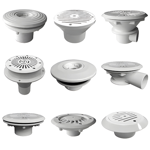 Fittings: Pool grating overflow grills, pool skimmers, pool main drains, pool lane ropes, safety visible check valves, ball valves